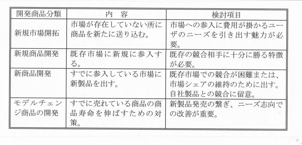 リスクは小さく、成功の確率は大きい、製品開発期間の短縮が必要である。一定の技術水準とマーケティングが重要な要素となる。