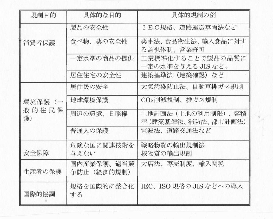 規制の目的は、いろいろである。上記の消費者保護のほか環境保護や生産者の保護まで多くの規制が存在している。図表1-5に規制の種類と目的を示す。